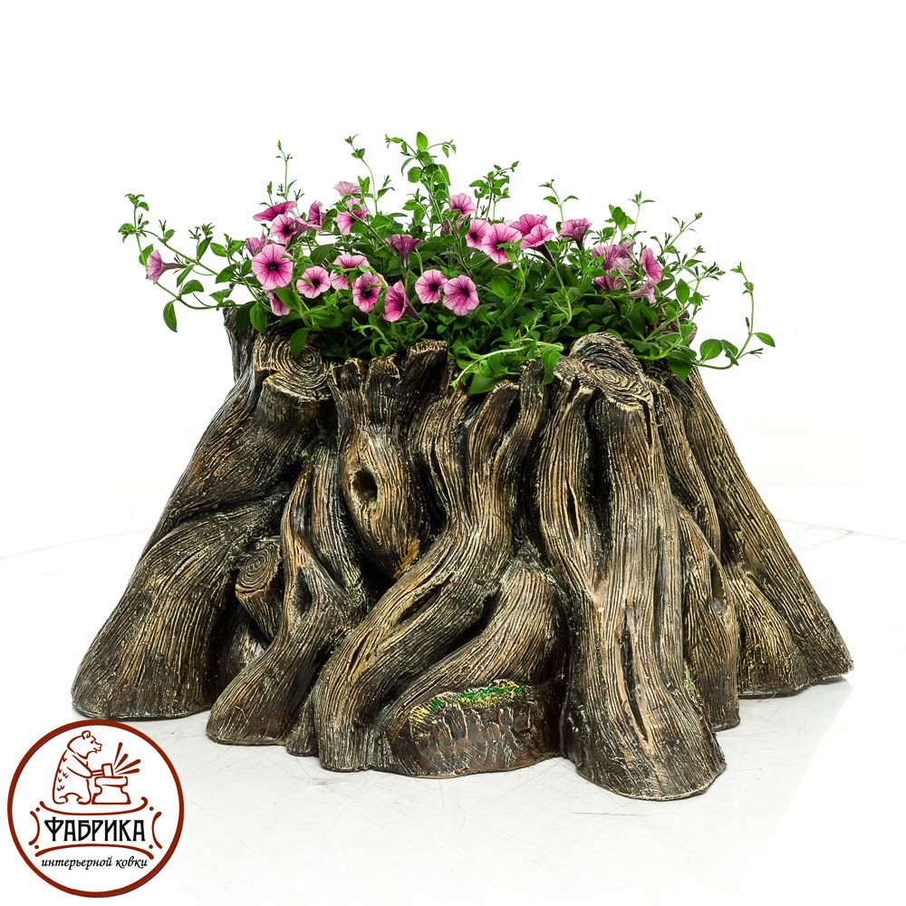 Кашпо для цветов пень-коряга. В специальное углубление высаживаются цветы, за которыми легко ухаживать. Кашпо изготовлено из стеклопластика, влагостойкого и прочного материала, подходит для уличного применения.