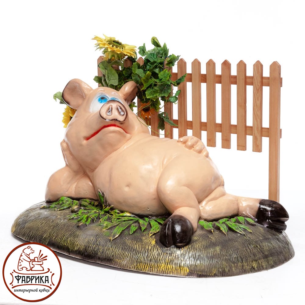 Веселая свинка у забора готова закрыть собой любое техническое отверстие в Вашем саду. Фигуру также можно использовать как самостоятельный декор территории садового участка или общественного сквера, парка.