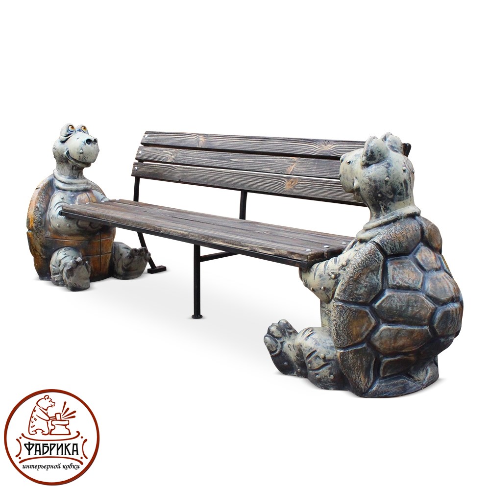 Лавка детская со спинкой. Симпатичные фигурки черепах выполнены из стеклопластика, влагостойкого, ударопрочного материала для уличного применения. Поэтому можно смело оставлять данную скамейку на открытом воздухе. Деревянная поверхность сиденья покрыта специальной пропиткой от влаги. Прочный кованый каркас способствует устойчивому положению скамейки на ровной поверхности.