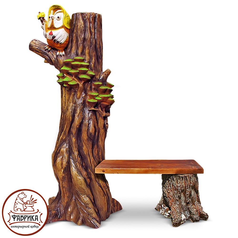 Сова на дереве лавочка. Материал изготовления - стеклопластик. Состоит из двух оснований и лавочки. Отличается высокой прочностью и необычным дизайном.