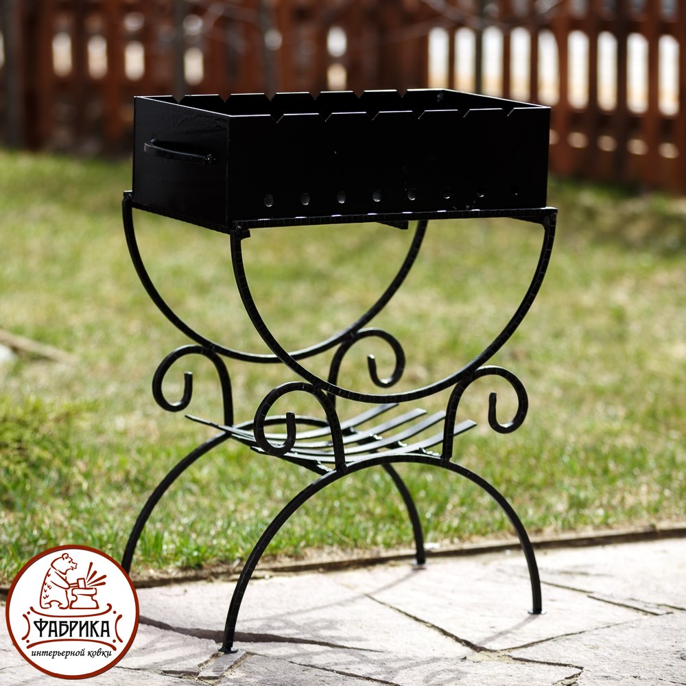 Кованый мангал 861-17 с изящными коваными ножками. А специальная подставка для дров внизу, поможет сохранить дрова в сухости. Конструкция из кованого металла украшена, изящной ажурной ковко.