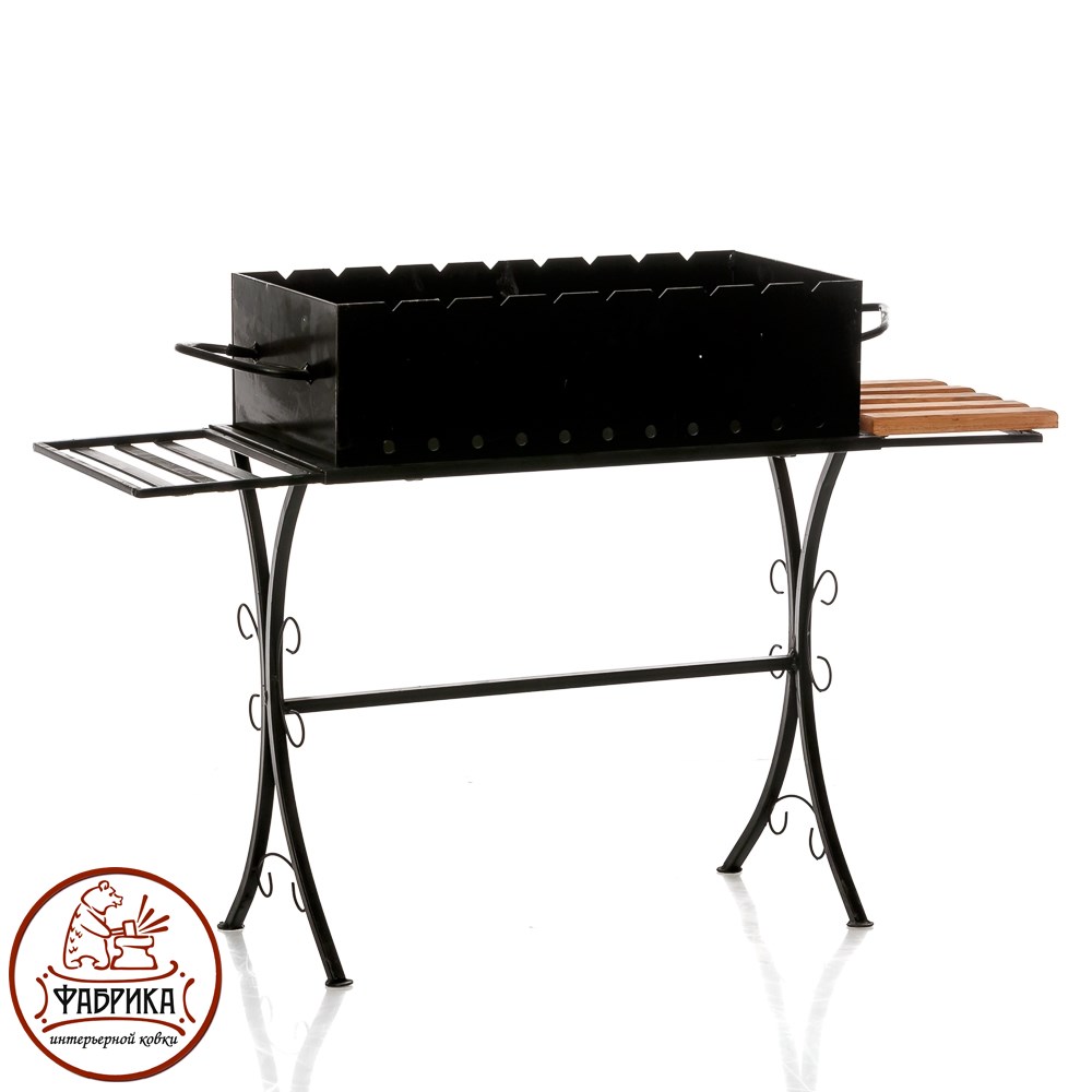 Мангал 961-20 для дачи изготовлен из металла. С обеих сторон находятся полки для посуды и других аксессуаров. Полки являются съемными, что удобно при перемещении и транспортировке мангала. Толщина стенок ящика на мангале составляет 3 мм.