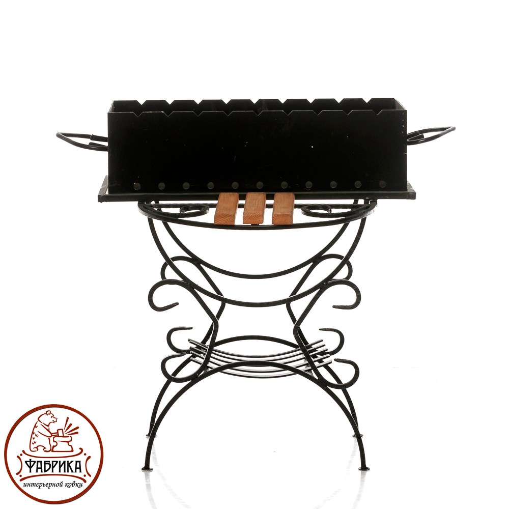 Кованый мангал 861-21R с изящными коваными ножками. А специальная подставка для дров внизу, поможет сохранить дрова в сухости. Конструкция из кованого металла украшена, изящной ажурной ковко.