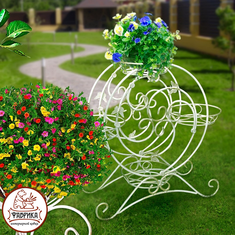 Садовая подставка для цветов 14-204, украшена изящной ажурной ковкой и сможет разместить на себе 4 цветочных горшка. Надёжная констуркция данной модели позволяет без всяких опасений размещать её в саду.