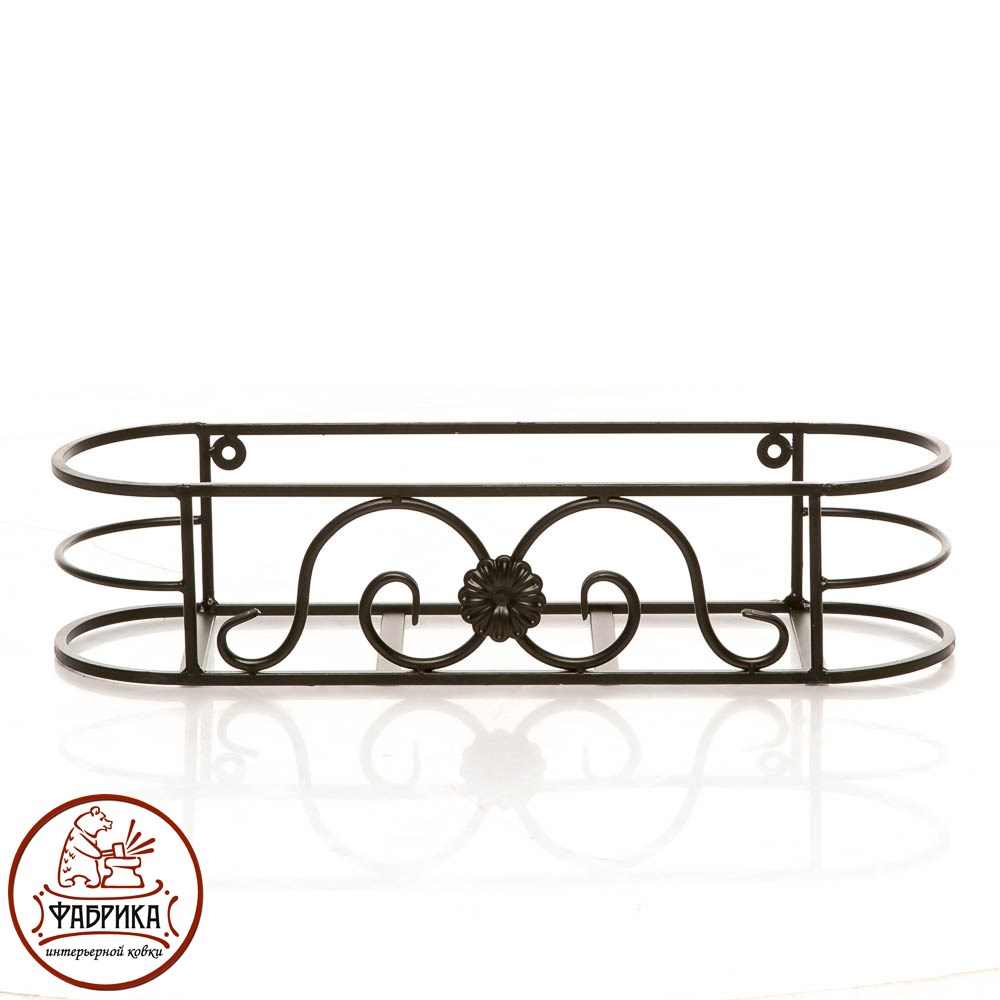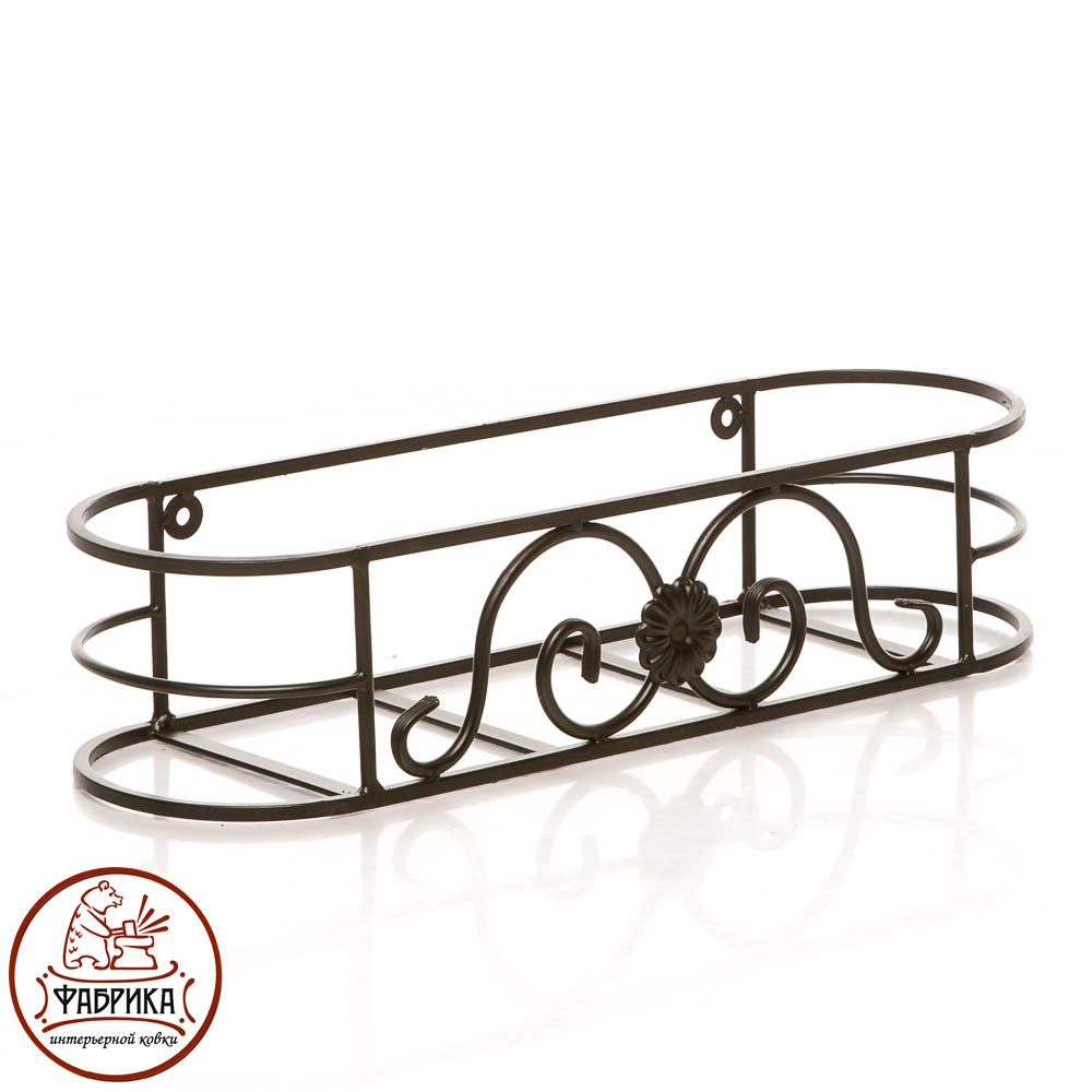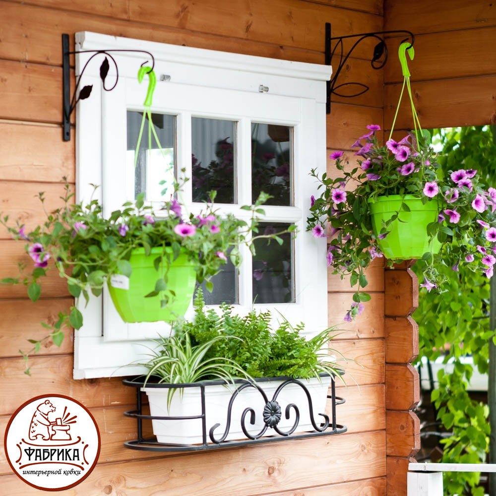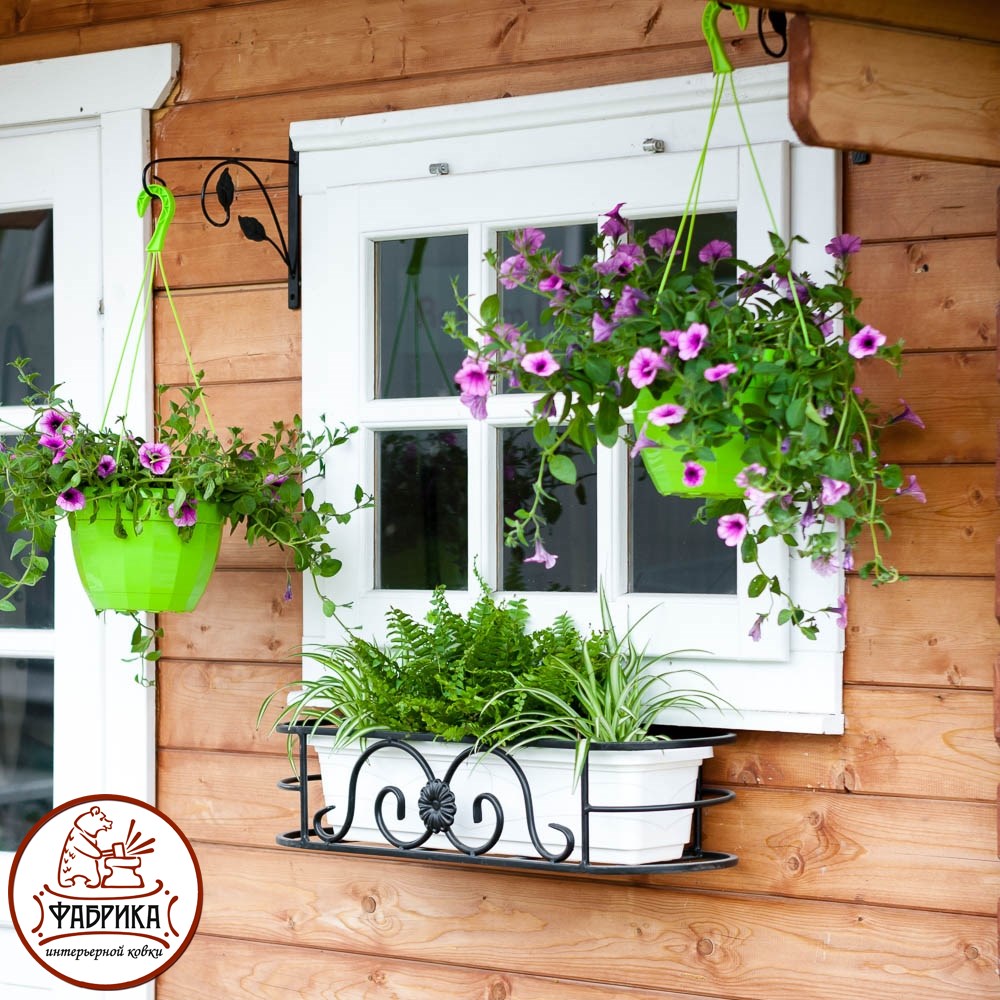 Подставка за окно для цветов изготовлена из металла и украшена изящными коваными деталями. Крепится с помощью шурупов к вертикальной поверхности.