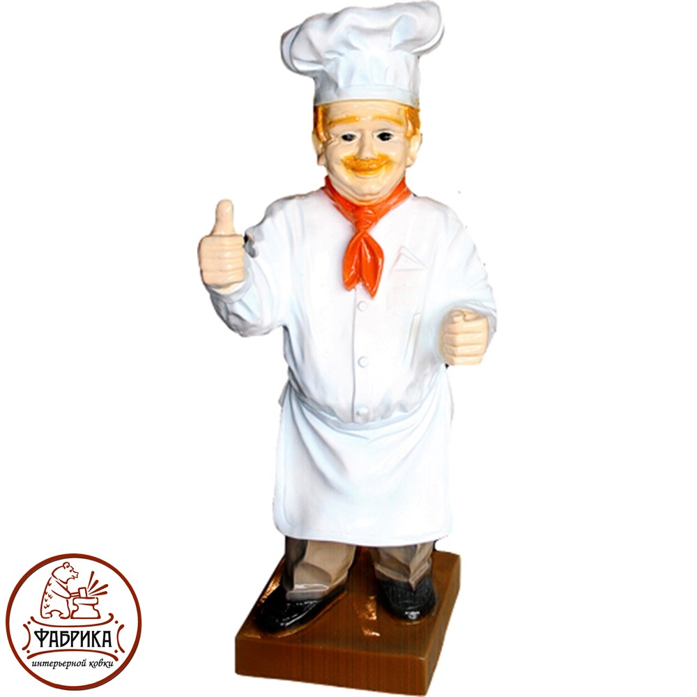Фигура повара выполнена из прочного и устойчивого к погодным условиям материала - стеклопластика. Рекламная фигура предназначена для декора общепита, пиццерий, ресторанов и кафе.