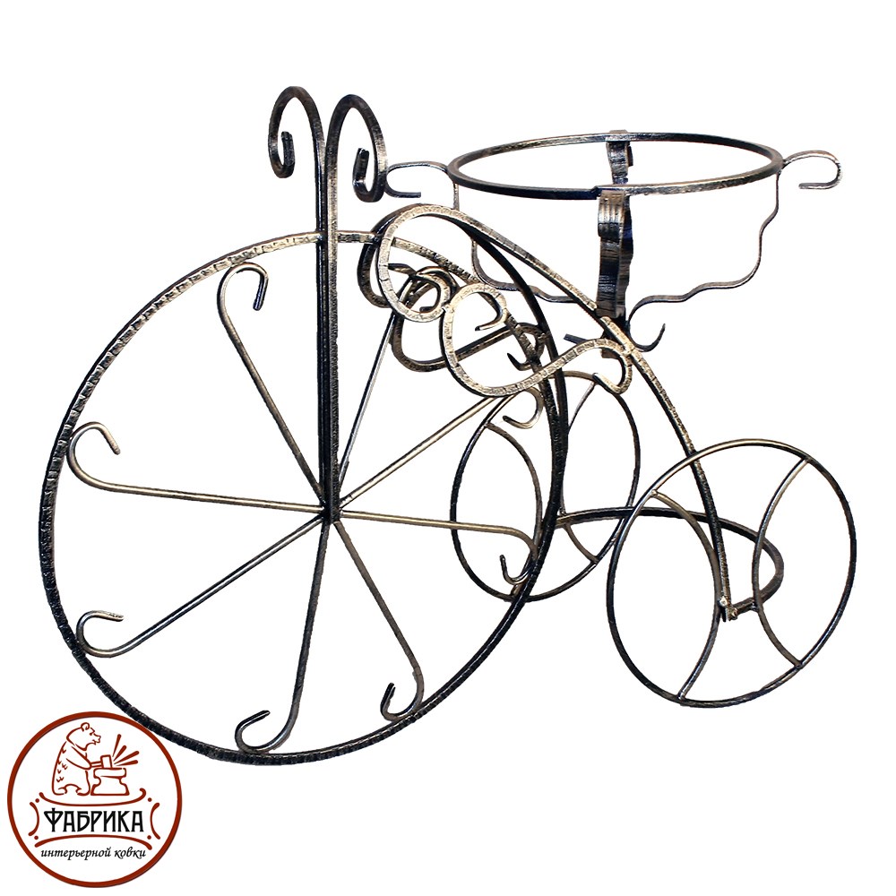 Подставка для цветов 53-007 выполнена в формпе изящного, старомодного велосипеда. Вся конструкция выполнена из кованного металла окрашеннго в цвет чёрного золота.