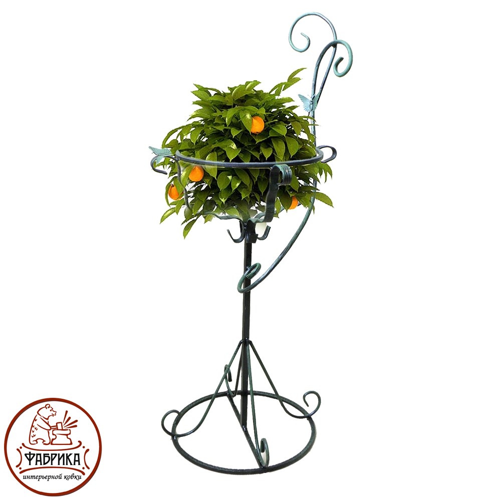 Подставка для цветов 53-037 выполнена в форме изящной стоки, и предназначена для размещения одного большого цветочного горшка. Она покрашена в темно зелёный цвет и украшена завитками и фигурками кованых бабочек. Её основание укреплено множеством завитков, что обеспечивает подставке высокую устойчивость и надежность установки цветов.