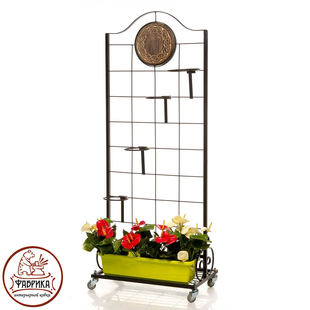 Шпалера ширма для размещения горшечных цветов и создания живого уголка в саду. Лоза вьющихся растений взбирается по прутьям решетчатой конструкции, которая выполняет роль поддержки, благодаря чему создается густой зеленый забор с яркими цветками.