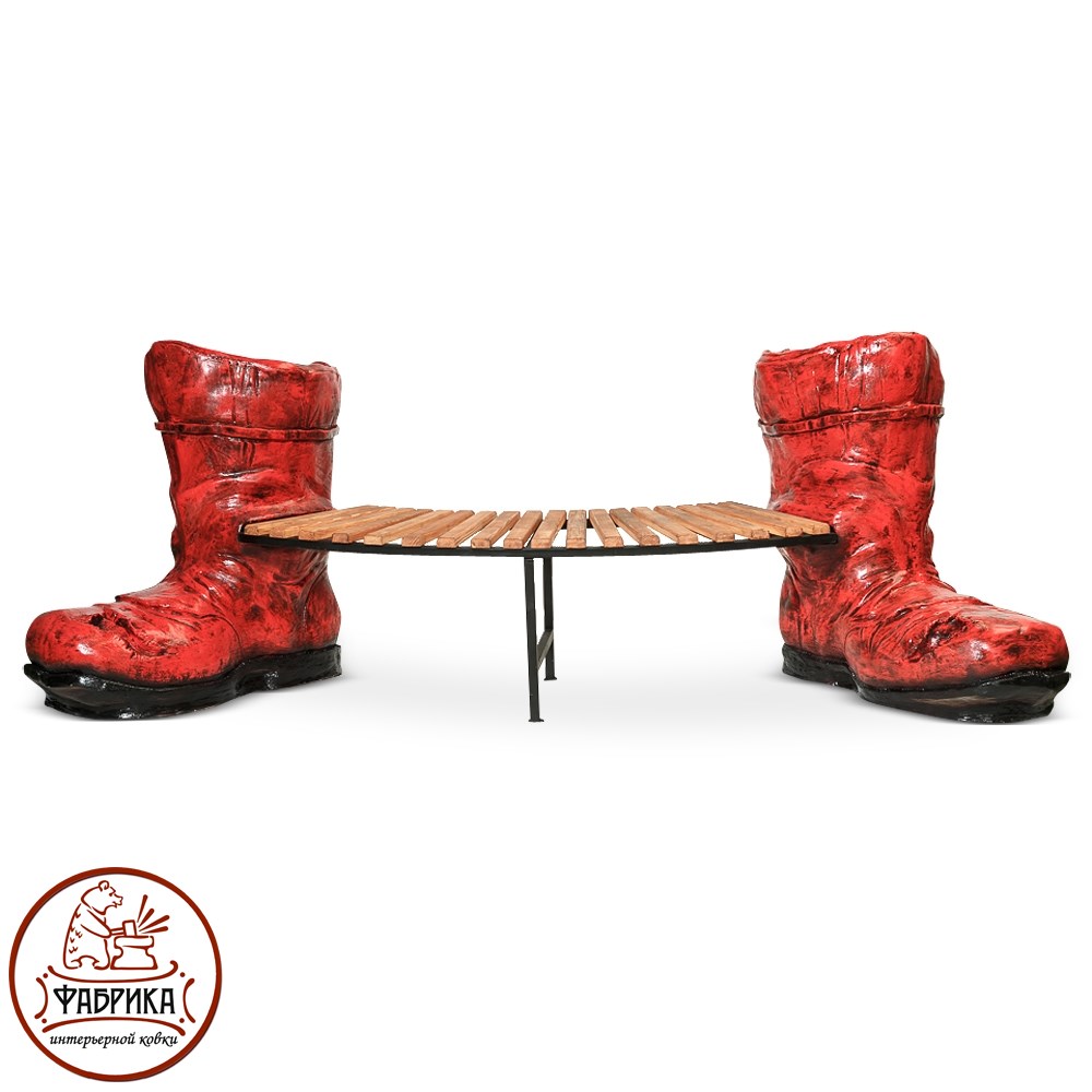 Скамейка сапоги. Фигуры сапог выполнены из стеклопластика. Скамейка имеет изогнутый вид, а также опору снизу для более устойчивого удержания людей и нахождения на ровной поверхности. Скамейка является разборной и крепится к фигурам сапог с помощью шурупов (шурупы входят в комплект).