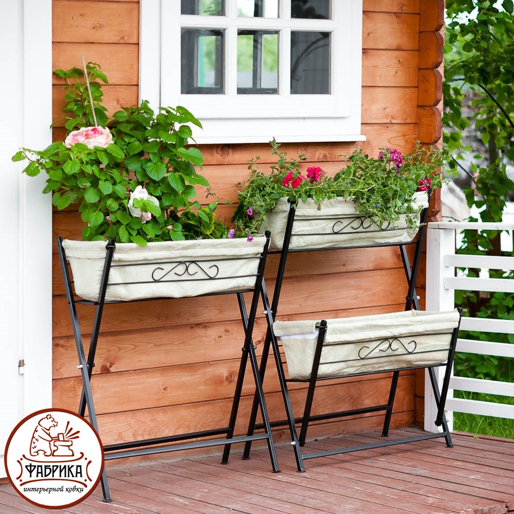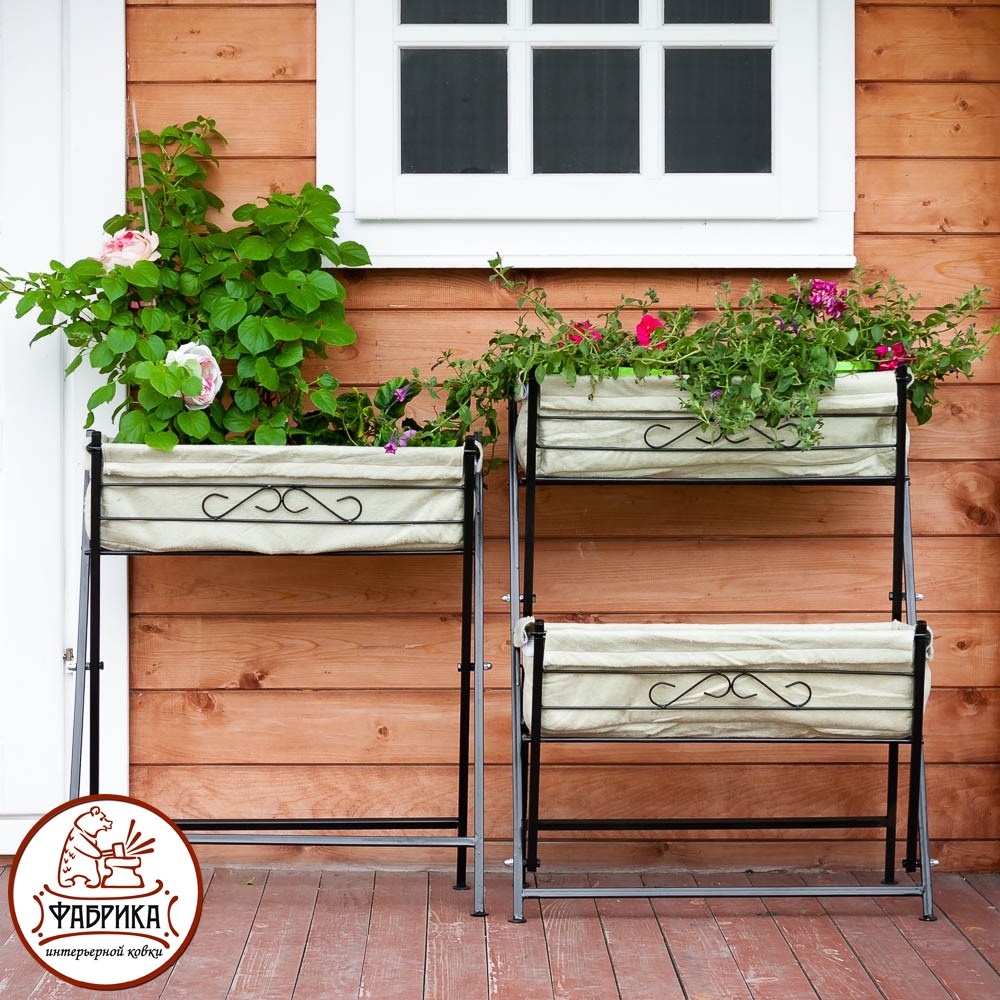 Мягкое кашпо входит в комплект. В кашпо высаживают цветы. Благодаря высоким ножкам обеспечивается удобный доступ и уход за растениями. Складной вариант подходит для перемещения цветочницы в любое место садового участка.